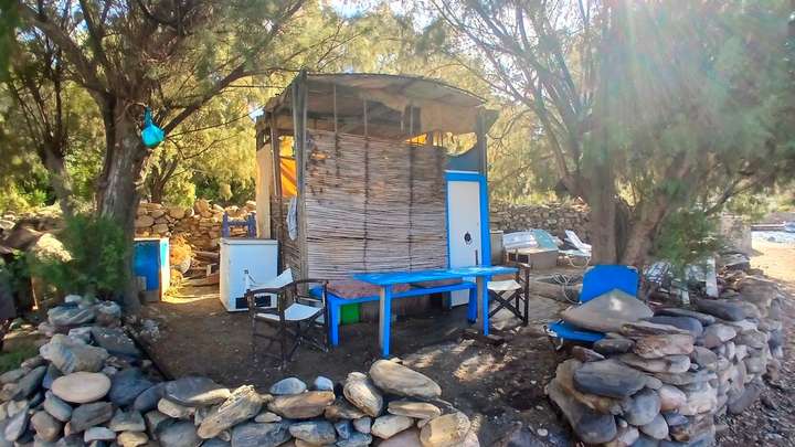 The small, sandy beach boasts a rocky seabed and is surrounded by lush tamarisk trees, providing a natural canopy for those seeking shade and relaxation.