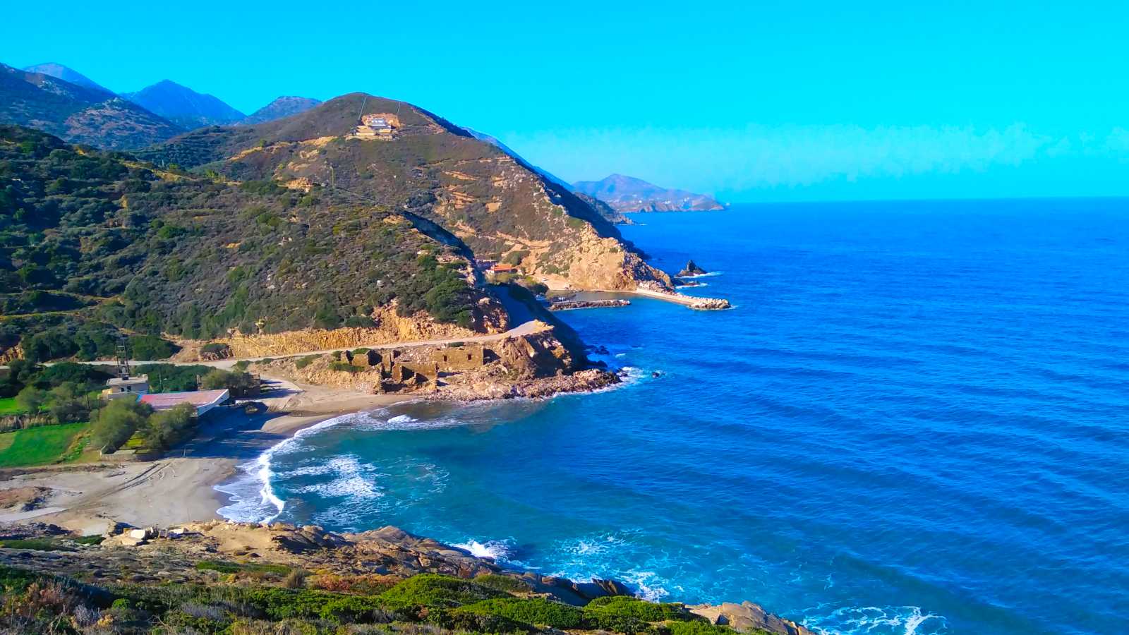 To the west of the beach, by the sea, are the ruins of the old warehouse and customs house. The fruits of the carob tree were once stored here.
